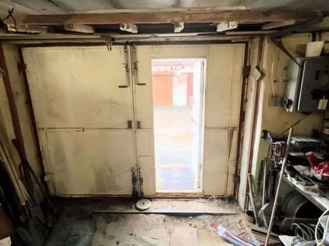 Входная группа была изменена, убраны ворота, заложена пеноблоком и утеплена минватой, поставлена металическая дверь. При желании стену легко разобрать и вернуть ворота