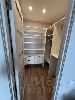Комплект посуды, сковороды. В квартире расположена отдельная гардеробная комната со стеллажами и выдвижными полками.