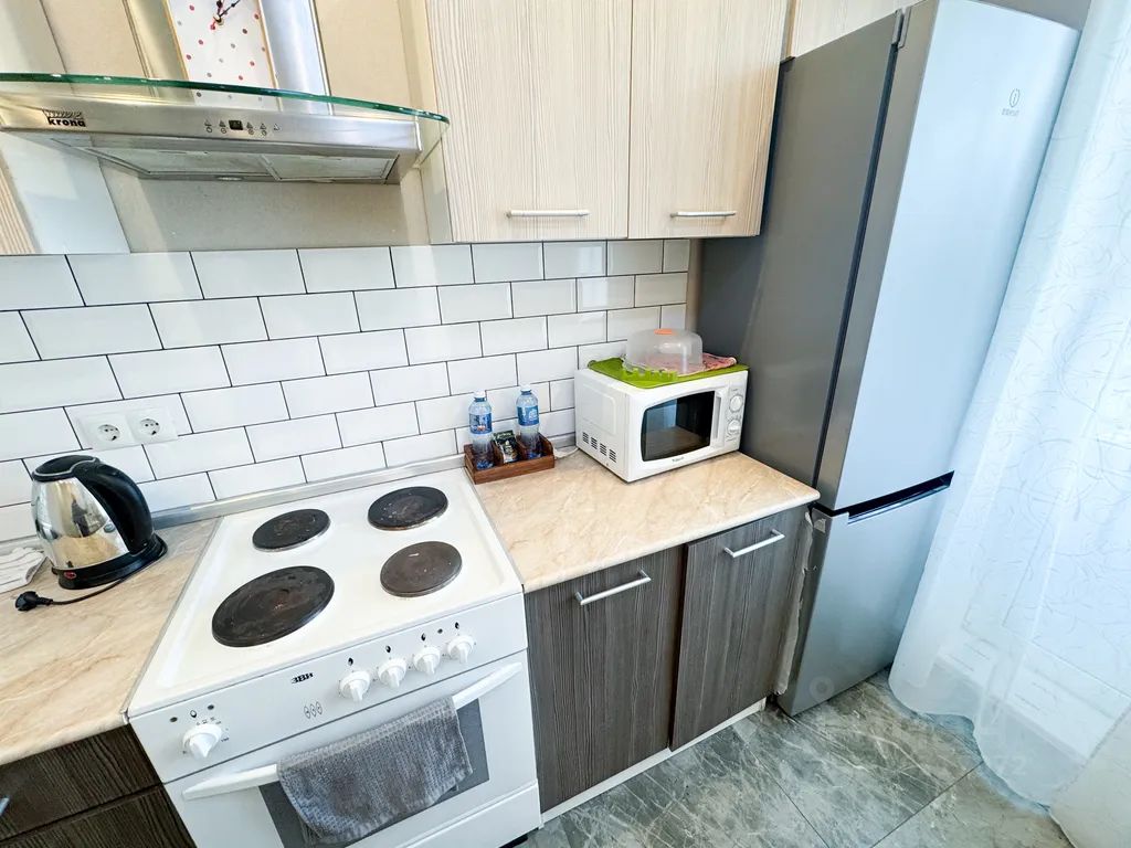 Бытовая техника: холодильник, плита, микроволновка, чайник, телевизор, стиральная машина, фен, утюг.