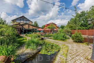 УЧАСТОК: 35 соток. Ландшафтный дизайн, множество фотозон. Ухоженная зеленая территория. Высажены деревья, кустарники и цветы. Дорожки облагорожены. Мангальная зона. Пространство для выездных регистраций. Скамейки. Зонтики и шезлонги для принятия солнечных ванны. Садовая мебель. Баскетбольная площадка, теннисный стол. Живые павлины. Искусственный пруд с несколькими мостиками. Множество стильных декоративных сооружений. Садовые качели. Детская площадка с горкой, качелями и др. Просторная беседка. Вся территория освещается. Парковка
