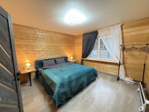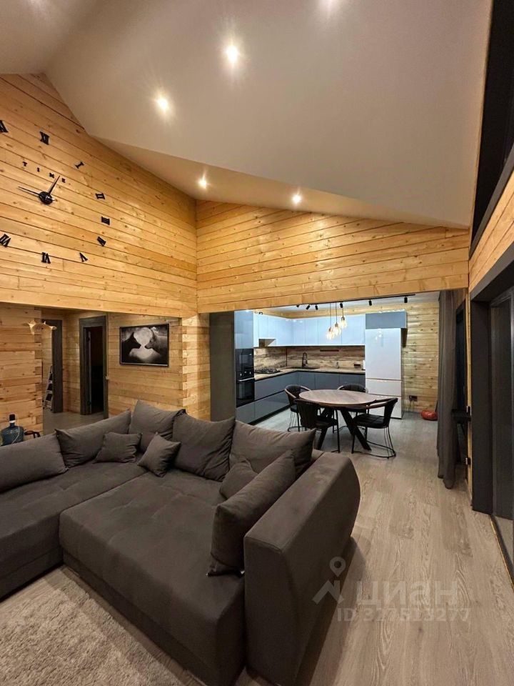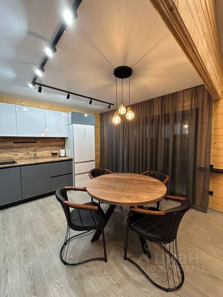 Кухня оборудована современной техникой и удобной обеденной зоной. В доме расположены 2 санузла: с душевой кабиной и с ванной. Ванные комнаты оформлены деревом и оснащены всем необходимым, включая стиральную машину. На территории дома есть терраса, где можно наслаждаться свежим воздухом и видом на лес.