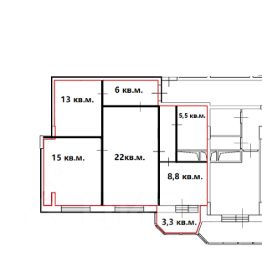 Квартира общей площадью 69,5 кв. м., из них три изолированные комнаты (15, 22, 13 кв. м.), одна комната без окна. Кухня 8,8 кв. м., санузел совмещенный 5,5 кв. м., на кухне лоджия.